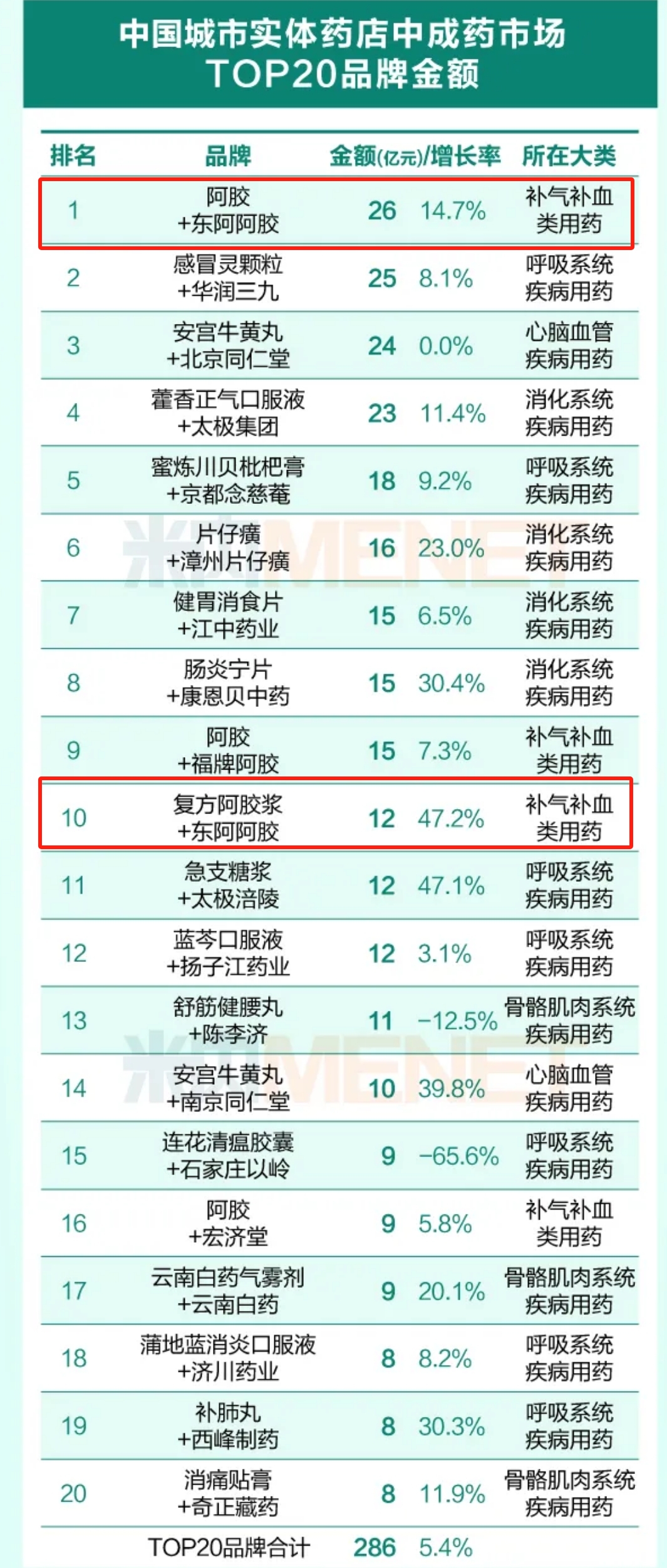 近日,米內(nèi)網(wǎng)發(fā)布的《中國城市實(shí)體藥店終端競(jìng)爭(zhēng)格局》報(bào)告顯示,2023年,東阿阿膠旗下產(chǎn)品以出色的銷售表現(xiàn),強(qiáng)勢(shì)領(lǐng)跑中國城市實(shí)體藥店中成藥市場(chǎng)補(bǔ)氣補(bǔ)血用藥品類。其中,阿膠以26億元銷售額位列TOP1,復(fù)方阿膠漿以12億元銷售額位列TOP10。