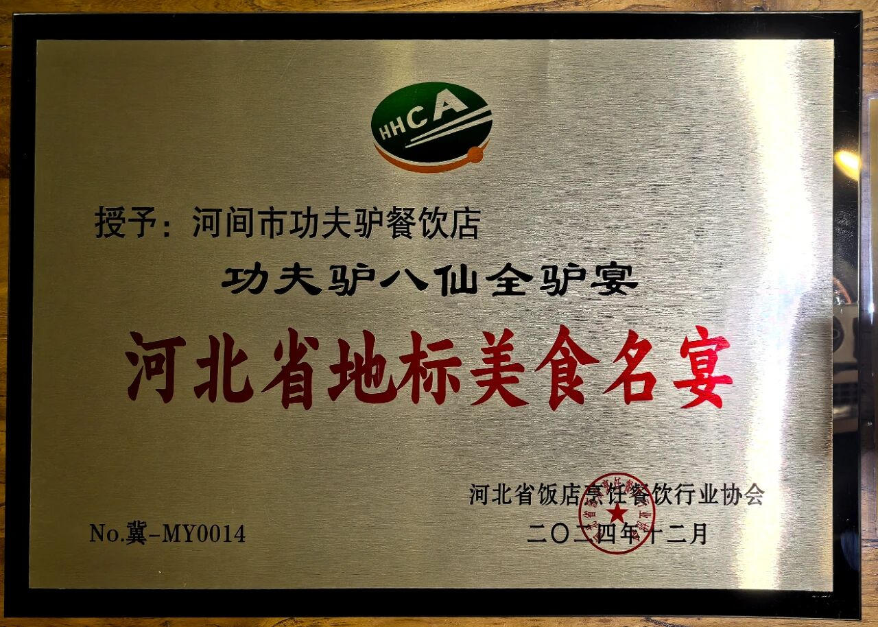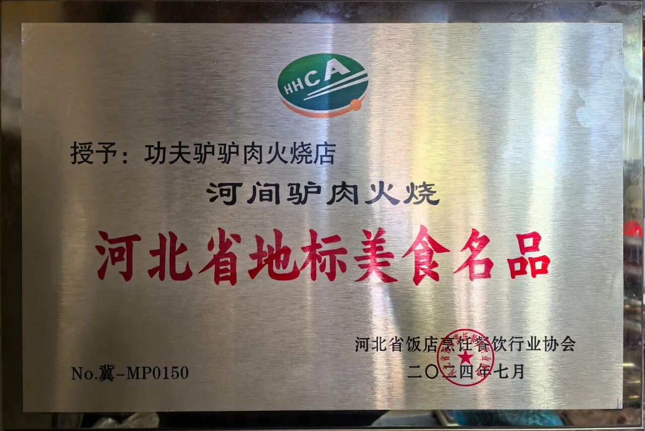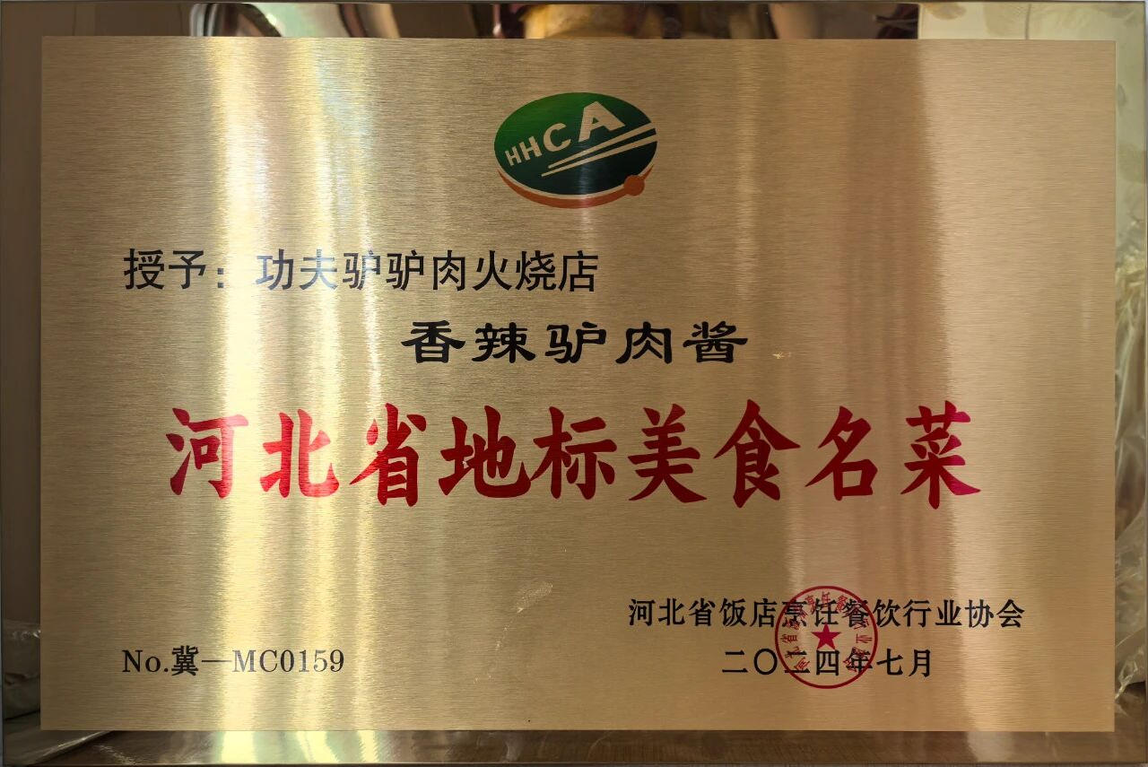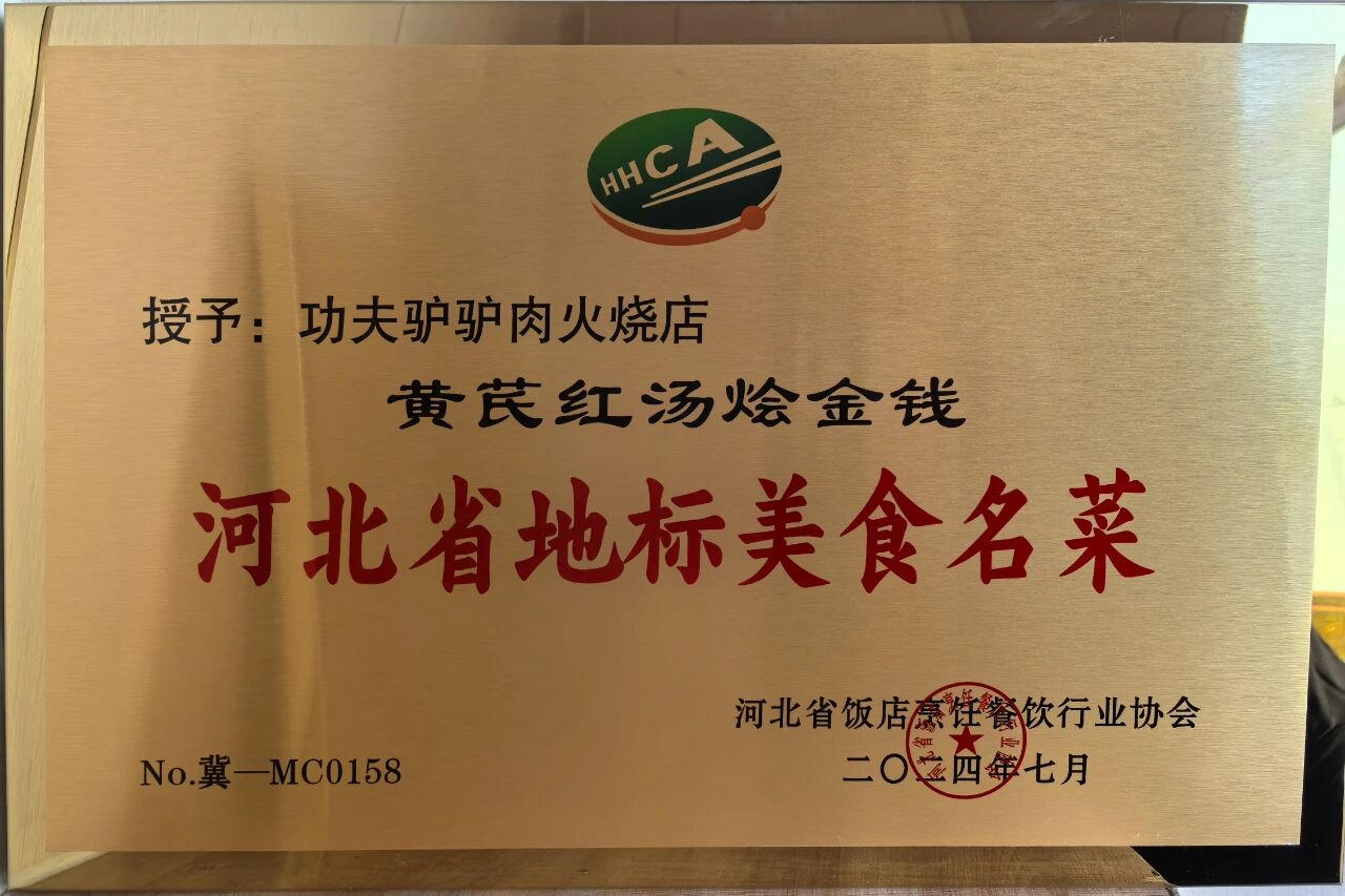 2024年,功夫驢驢肉火燒入選首批“河北省地標(biāo)美食”;“燕趙名品”;“滄州手信”。功夫驢全驢宴被評為河北地標(biāo)名宴,功夫驢黃芪紅湯燴金錢、功夫驢驢肉辣醬被評為河北地標(biāo)名菜。
