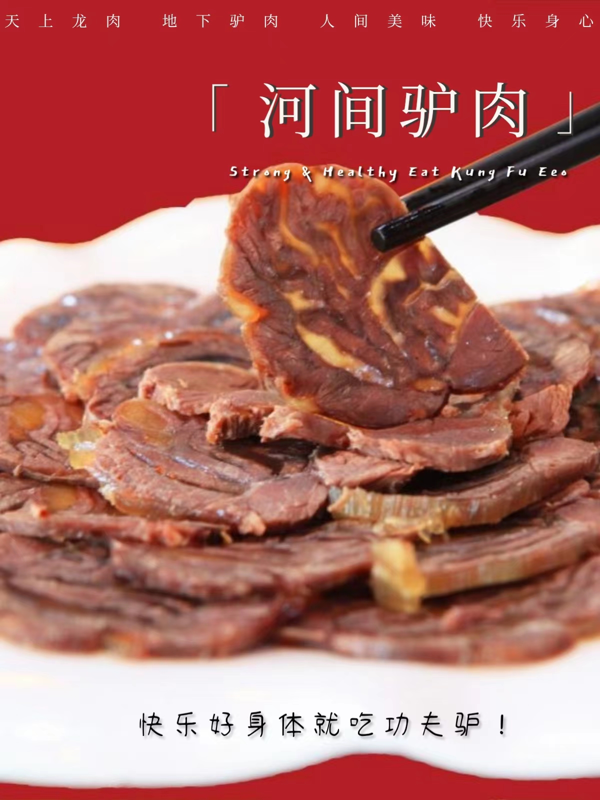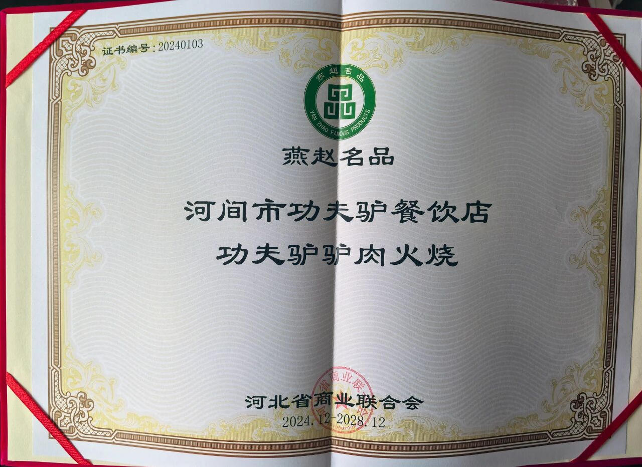 河間驢肉火燒制作技藝在2012年入選河北省非物質(zhì)文化遺產(chǎn),功夫驢傳統(tǒng)醬驢肉也于2025年入選市級非物質(zhì)文化遺產(chǎn)。功夫驢同時擁有兩個非遺的制作技藝,成為地方飲食文化的 “活化石”。