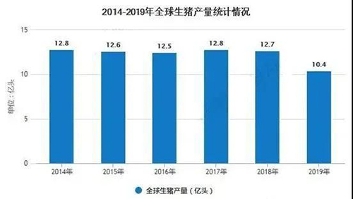 中國(guó)為全球豬肉產(chǎn)量和消費(fèi)量最高的國(guó)家,2018年非洲豬瘟導(dǎo)致中國(guó)生豬產(chǎn)量大幅下降。根據(jù)美國(guó)農(nóng)業(yè)農(nóng)業(yè)部的數(shù)據(jù)顯示,2019年全球生豬產(chǎn)量為10.4億頭,降至自2013以來(lái)的最低水平,較2018年同比下降18.26%。