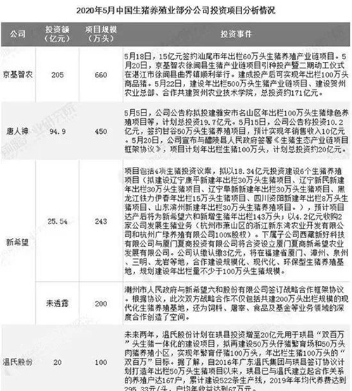 但價(jià)格下降并未影響企業(yè)的投資熱情。2020年3月,農(nóng)業(yè)農(nóng)村部、發(fā)改委、財(cái)政部等多個(gè)部門(mén)發(fā)布了一系列政策支持生豬養(yǎng)殖產(chǎn)業(yè),各大公司紛紛布局養(yǎng)殖項(xiàng)目。