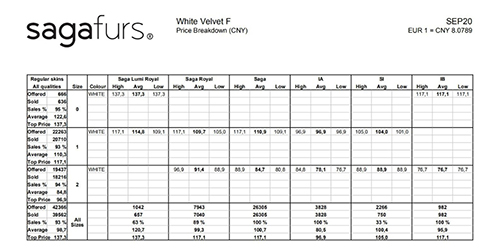 首日總的銷售率達到了80%,其中白色天鵝絨母皮的銷售率幾乎達到了100%。雖然價格水平依然差強人意,但是高銷售率釋放出了積極信號,并得到了業(yè)界的歡迎。與近期的國際拍賣會相比,有些品類的價格有所上漲。