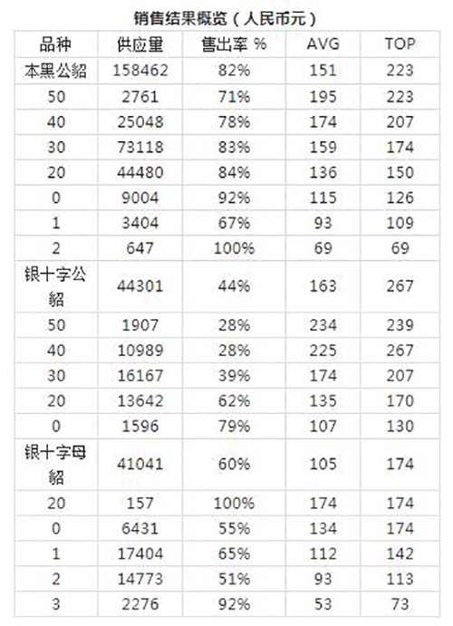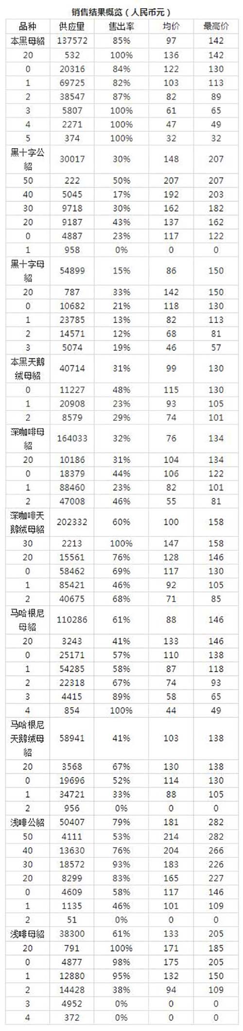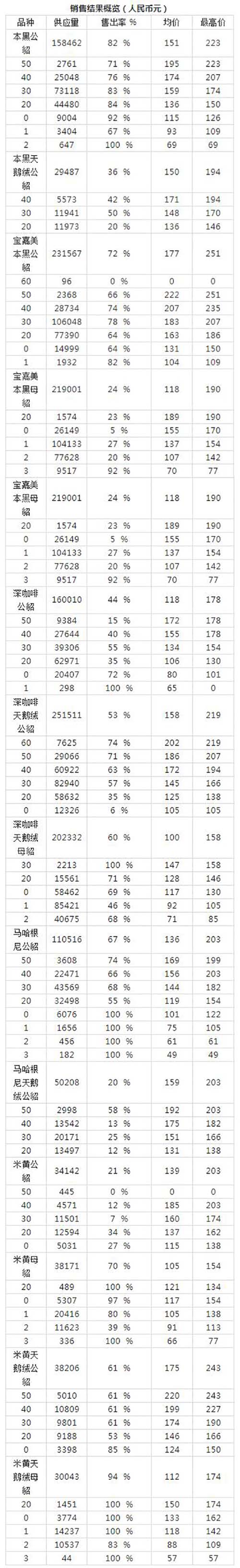 當日供應的62.1萬張深啡水貂公皮銷售了70%,其中正常皮達到了50%以上。馬赫根尼和本黑正常皮的銷售率低于深啡。最后銷售的米黃水貂母皮達到了非常高的銷售率,但米黃水貂公皮的銷售率較低,特別是經典毛長的品種。
