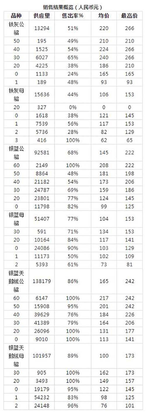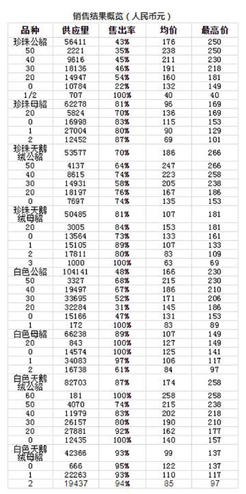 首日總的銷售率達到了80%,其中白色天鵝絨母皮的銷售率幾乎達到了100%。雖然價格水平依然差強人意,但是高銷售率釋放出了積極信號,并得到了業(yè)界的歡迎。與近期的國際拍賣會相比,有些品類的價格有所上漲。中國買家明顯主導了購買,而土耳其買家也表現積極,尤其是在公皮方面。