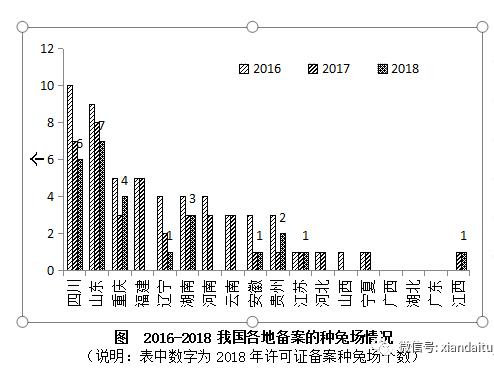 根據(jù)《中國畜牧業(yè)統(tǒng)計資料2017》的統(tǒng)計,2017年我國共有種兔場233個,其中,四川和浙江最多,分別為127和17個,山東和安徽分別為12和10個。但2016年我國具有備案許可證的種兔場僅為54個,2017年下降到40個,2018年進一步下降到27個。可以看出,2017年我國具有備案許可證的種兔場占全部種兔場的約17.16%,說明了我國種兔場的管理還缺乏規(guī)范。從備案兔場的地域分布來看(圖),備案種兔場基本分布在我國家兔主產(chǎn)地,比如四川、山東、重慶和湖南等地。
