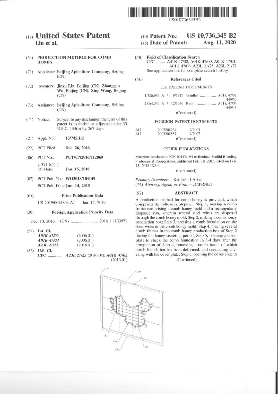 經(jīng)歷了四年漫長的申報(bào)期,由北京市蜂業(yè)公司牽頭申報(bào)的國際發(fā)明專利“一種巢蜜生產(chǎn)方法”在美國獲得正式授權(quán)!這是我國在巢蜜生產(chǎn)技術(shù)方面的首個(gè)國際發(fā)明專利,標(biāo)志著我國蜂業(yè)生產(chǎn)技術(shù)領(lǐng)域得到了國際社會(huì)的認(rèn)可,逐步走在了世界前列。我國由養(yǎng)蜂大國向養(yǎng)蜂現(xiàn)代化強(qiáng)國不斷邁進(jìn)!