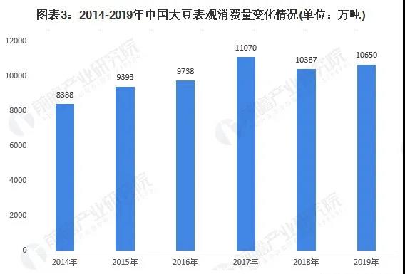 圖表3:2014-2019年中國大豆表觀消費(fèi)量變化情況(單位:萬噸)