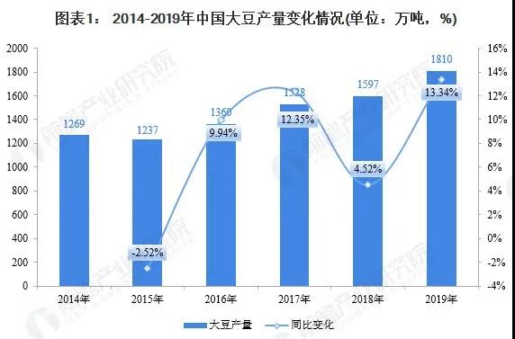 大豆是我國重要的糧食作物之一,常用來做各種豆制品、飼料、榨取豆油、釀造醬油和提取蛋白質(zhì)。2014-2019年,我國大豆產(chǎn)量基本上呈現(xiàn)逐年增長的態(tài)勢,2019年,我國大豆產(chǎn)量實現(xiàn)1810萬噸,較2018年增長13.34%。