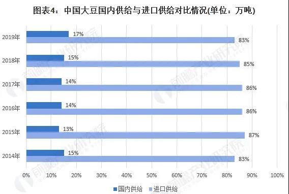 從我國大豆國內(nèi)供給與進(jìn)口供給的對比來看,我國大豆的需求多依賴進(jìn)口滿足。2019年,我國大豆國內(nèi)供給僅占總供給的17%,雖然較往年有所增長,但進(jìn)口供給仍在國內(nèi)供給的4倍以上。
