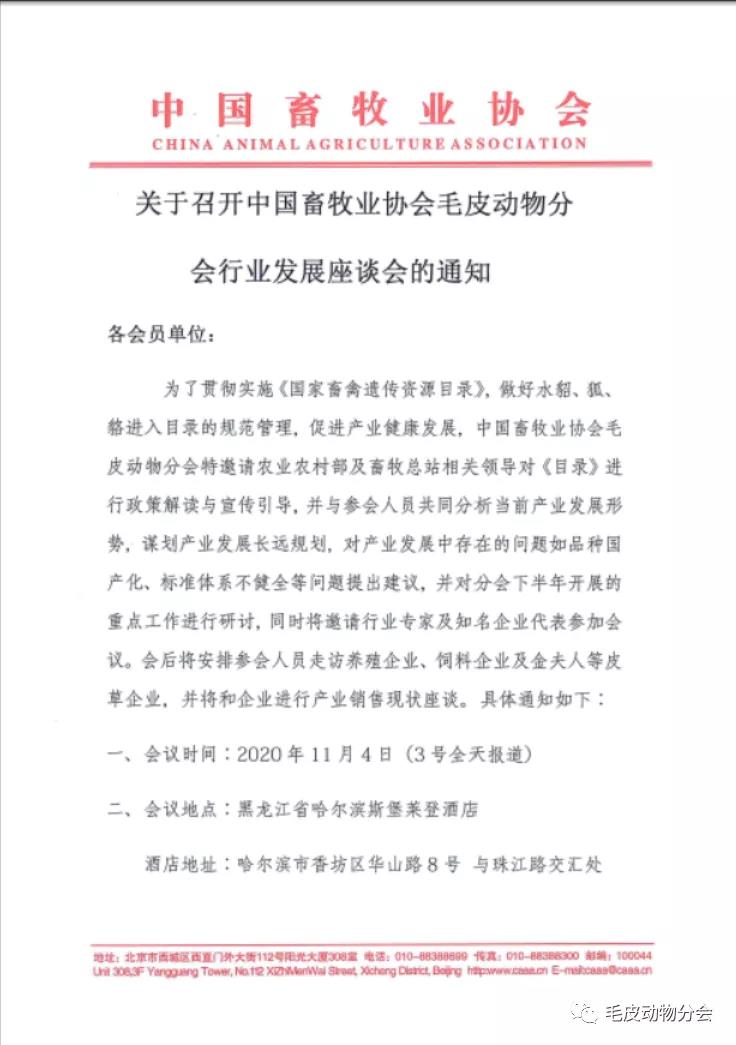 關(guān)于召開中國(guó)畜牧業(yè)協(xié)會(huì)毛皮動(dòng)物分會(huì)行業(yè)發(fā)展座談會(huì)的通知
