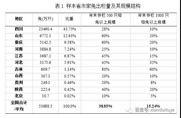 資料來(lái)源:國(guó)家兔產(chǎn)業(yè)技術(shù)體系問(wèn)卷調(diào)查匯總結(jié)果。說(shuō)明:對(duì)于規(guī)模的劃分,標(biāo)準(zhǔn)不盡相同。不同地區(qū)差異較大,不同品種也有較大差異。這里采用兩個(gè)相對(duì)標(biāo)準(zhǔn):(1)母兔存欄500只,即年出欄商品兔月1.5萬(wàn)只,為小規(guī)模兔場(chǎng);(2)母兔存欄1000只,即年出欄3萬(wàn)只,為中大型規(guī)模兔場(chǎng)。