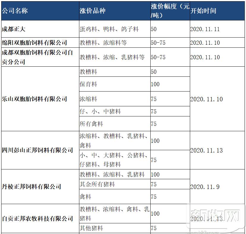 截止11月10日,新希望、正邦、正大、雙胞胎等近20家企業(yè)陸續(xù)提價了飼料價格,漲幅50-100元/噸。