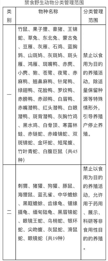 國(guó)家林草局近日發(fā)布通知明確對(duì)64種在養(yǎng)禁食野生動(dòng)物分類管理,其中竹鼠、果子貍、豪豬等45種野生動(dòng)物今年12月底前要引導(dǎo)停止養(yǎng)殖刺猬、豚鼠、眼鏡蛇等19種野生動(dòng)物允許非食用目的的養(yǎng)殖,
