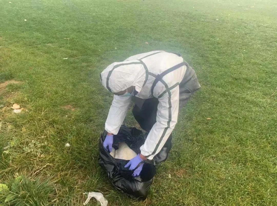 工作人員準(zhǔn)備對(duì)病死天鵝作無(wú)害化處理(圖|新京報(bào))