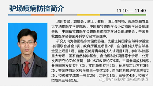 近日,新疆維吾爾自治區(qū)重點(diǎn)研發(fā)計(jì)劃項(xiàng)目“南疆驢產(chǎn)業(yè)關(guān)鍵技術(shù)集成與示范”為了進(jìn)一步鞏固新疆脫貧攻堅(jiān)成果、全力貫徹落實(shí)鄉(xiāng)村振興戰(zhàn)略,繼續(xù)發(fā)揮項(xiàng)目實(shí)施對(duì)新疆乃至我國(guó)驢產(chǎn)業(yè)發(fā)展的服務(wù)帶動(dòng)作用,項(xiàng)目組將舉辦本年度第2期線上培訓(xùn)會(huì)。