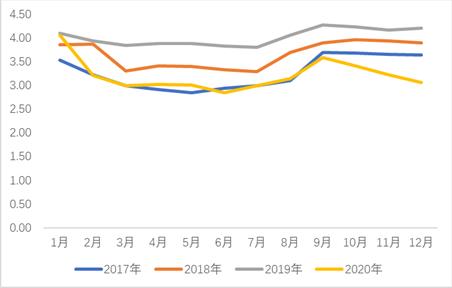 從鮮鴿蛋的月度平均價格看,本年度前三季度價格整體上與2017年相當(dāng),遠(yuǎn)低于2018和2019年。但四季度的價格更差,為近三年最低價,甚至低于2017年。鴿蛋的價格低迷與禽產(chǎn)品供大于求的整體行情有關(guān)。