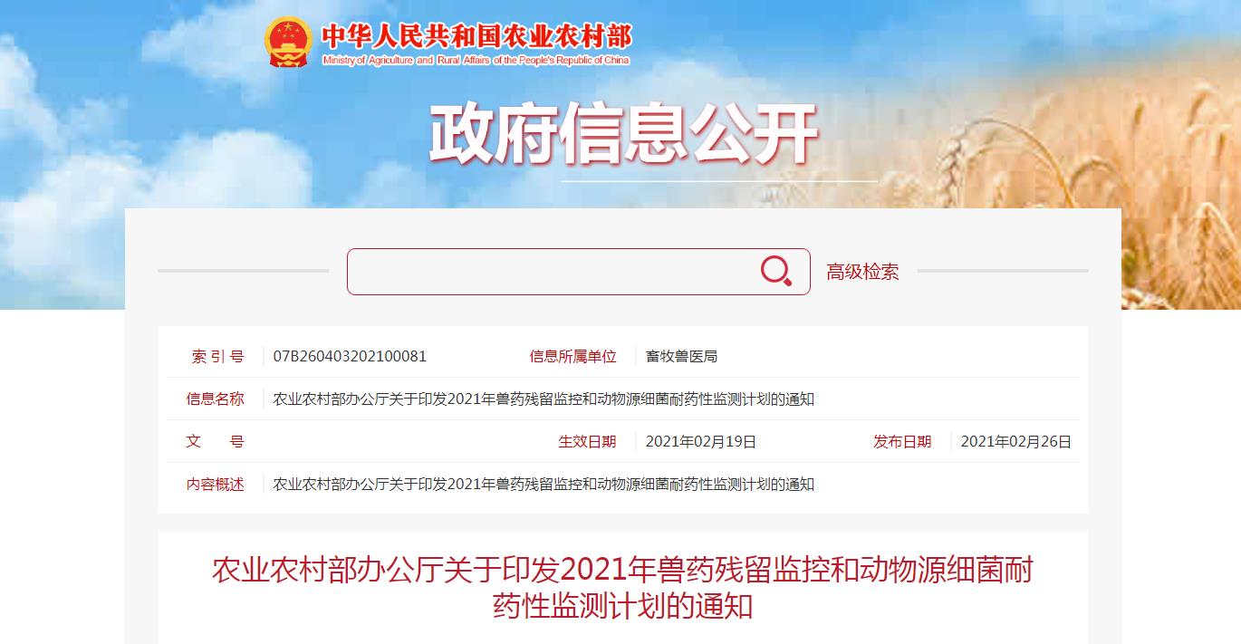 近日,農業(yè)農村部辦公廳印發(fā)《2021年獸藥殘留監(jiān)控和動物源細菌耐藥性監(jiān)測計劃的通知》,通知內容如下: