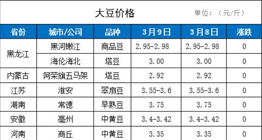 3月9日國產(chǎn)大豆價格大多維持穩(wěn)定,局部地區(qū)價格漲跌互現(xiàn),黑龍江地區(qū)商品豆裝車報價2.95-3.05元/斤,局部較上一日報價波動0.03-0.05元/斤;內(nèi)蒙古大豆裝車報2.9-2.92元/斤,較上一日報價持平;江蘇地區(qū)翠扇豆裝車報3.8-3.88元/斤,較上一日報價持平;河南地區(qū)中黃豆裝車報價3.35-3.45元/斤;河北地區(qū)中黃豆裝車報價3.3元/斤;湖南早熟豆裝車報3.75元/斤;湖北地區(qū)中黃豆報價3.55-3.6元/斤;安徽地區(qū)中黃豆裝車價3.38-3.43元/斤。