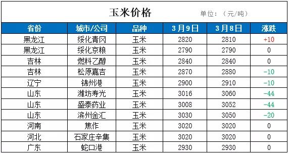 3月9日國內(nèi)地區(qū)玉米價格震蕩調(diào)整,全國玉米均價為2936元/噸,較上一日下跌2元/噸。