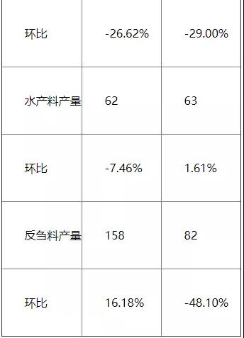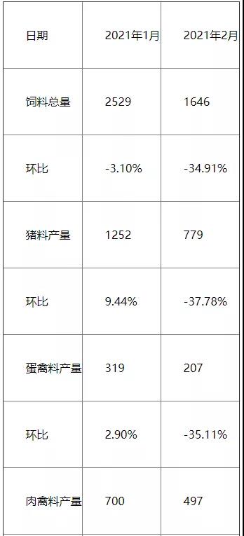 據(jù)中國(guó)飼料工業(yè)協(xié)會(huì)統(tǒng)計(jì),2021年1-2月,飼料總產(chǎn)量4175萬(wàn)噸,同比增長(zhǎng)20.9%。其中,豬飼料產(chǎn)量2032萬(wàn)噸同比增長(zhǎng)79.9%;蛋禽、肉禽飼料產(chǎn)量分別為526萬(wàn)噸、1197萬(wàn)噸,同比分別下降7.8%、15.2%;水產(chǎn)、反芻動(dòng)物飼料產(chǎn)量分別為125 萬(wàn)噸、240萬(wàn)噸,同比分別增長(zhǎng)8.9%、31.2%。從飼料產(chǎn)量的同比數(shù)據(jù)來(lái)看,本年度飼料總產(chǎn)量尤其是豬料產(chǎn)量較為可觀,也反映出生豬產(chǎn)能在不斷地恢復(fù),預(yù)計(jì)蛋白原料總需求向好發(fā)展。但是從環(huán)比數(shù)據(jù)來(lái)看(如下表2),2月份飼料總產(chǎn)量和豬料、蛋肉禽、反芻料產(chǎn)量大幅下降,僅有水產(chǎn)料在2月環(huán)比小幅增加。由此可以看出,除了因春節(jié)前集中出欄導(dǎo)致飼料需求階段性下滑,還有1月份起開(kāi)始的非洲豬瘟影響仍在繼續(xù)甚至是加劇,環(huán)比由負(fù)轉(zhuǎn)正還需時(shí)日。