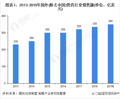 過去半個世紀(jì)以來,全球肉類消費總量和人均消費量均迅速增加。其中,全球肉類消費的增長主要來源于禽肉的增長,豬肉雖增長緩慢,但仍是最主要的肉類消費品種。而與之息息相關(guān)的獸藥行業(yè),也在肉類消費增長中得到了發(fā)展。在全球人口及其對食物需求持續(xù)增長的驅(qū)動下,全球獸藥行業(yè)市場規(guī)模穩(wěn)步增長,2013-2018年,國外獸藥行業(yè)銷售額從230億美元增長至335億美元,年均復(fù)合增長率約為7.8%。初步測算2019年市場規(guī)模超過350億美元。