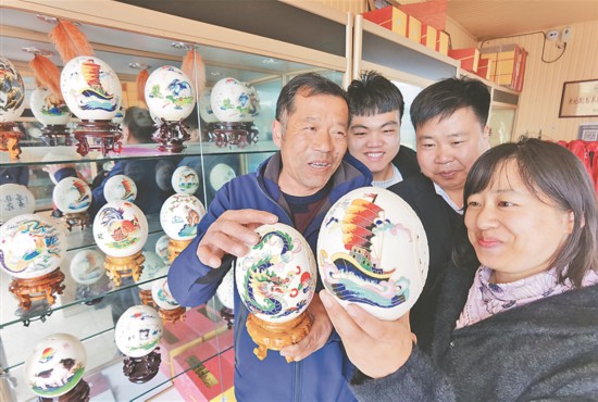 趙金柱(左一)在展示用鴕鳥蛋雕刻的工藝品。