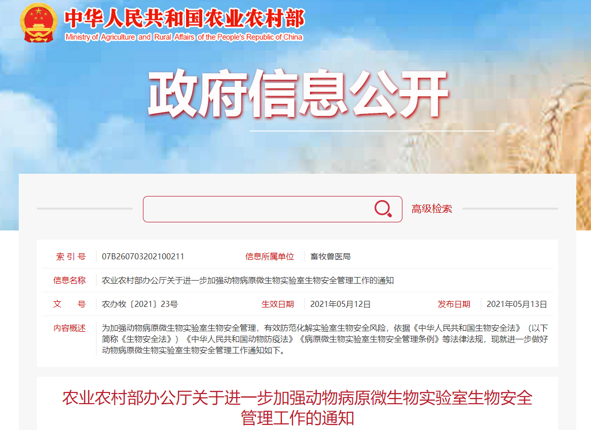 農(nóng)業(yè)農(nóng)村部辦公廳關(guān)于進一步加強動物病原微生物實驗室生物安全管理工作的通知