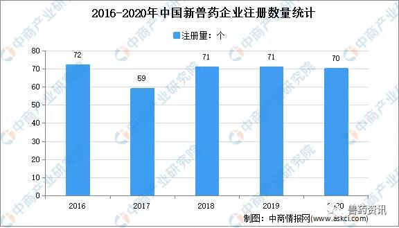 隨著國(guó)家出臺(tái)各項(xiàng)法律法規(guī)的實(shí)施,獸藥行業(yè)的生產(chǎn)經(jīng)營(yíng)逐步規(guī)范,產(chǎn)品質(zhì)量大幅度提高。2020年中國(guó)新獸藥注冊(cè)數(shù)量為70個(gè),比2019年減少1個(gè)。