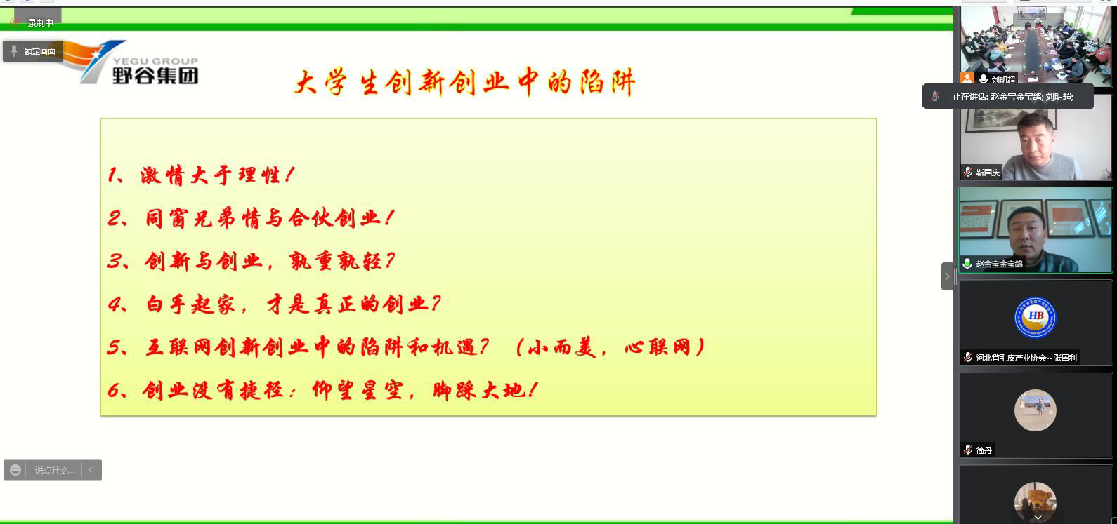 2021年11月13日上午,“特種養(yǎng)殖創(chuàng)業(yè)訓(xùn)練營——鄉(xiāng)村振興創(chuàng)新創(chuàng)業(yè)論壇”順利開課。本次論壇由河北農(nóng)業(yè)大學(xué)創(chuàng)新創(chuàng)業(yè)教育指導(dǎo)中心主辦。論壇邀請了河北省毛皮產(chǎn)業(yè)協(xié)會黨支部書記、執(zhí)行會長靳國慶,中國鴕鳥開發(fā)協(xié)會副會長、國家教委特聘萬人雙創(chuàng)導(dǎo)師劉福辰,野谷健康產(chǎn)業(yè)集團銷售總監(jiān)、中國畜牧業(yè)協(xié)會鴿業(yè)分會副秘書長趙金寶做主題報告。本次論壇由河北農(nóng)大劉明超老師主持,采用線上講解的方式。河北省毛皮產(chǎn)業(yè)協(xié)會秘書長、特種養(yǎng)殖信息網(wǎng)運營總監(jiān)張國利及省協(xié)會秘書處全體人員,河北農(nóng)業(yè)大學(xué)動物醫(yī)學(xué)院、動物科學(xué)院等學(xué)院學(xué)生參加了論壇。