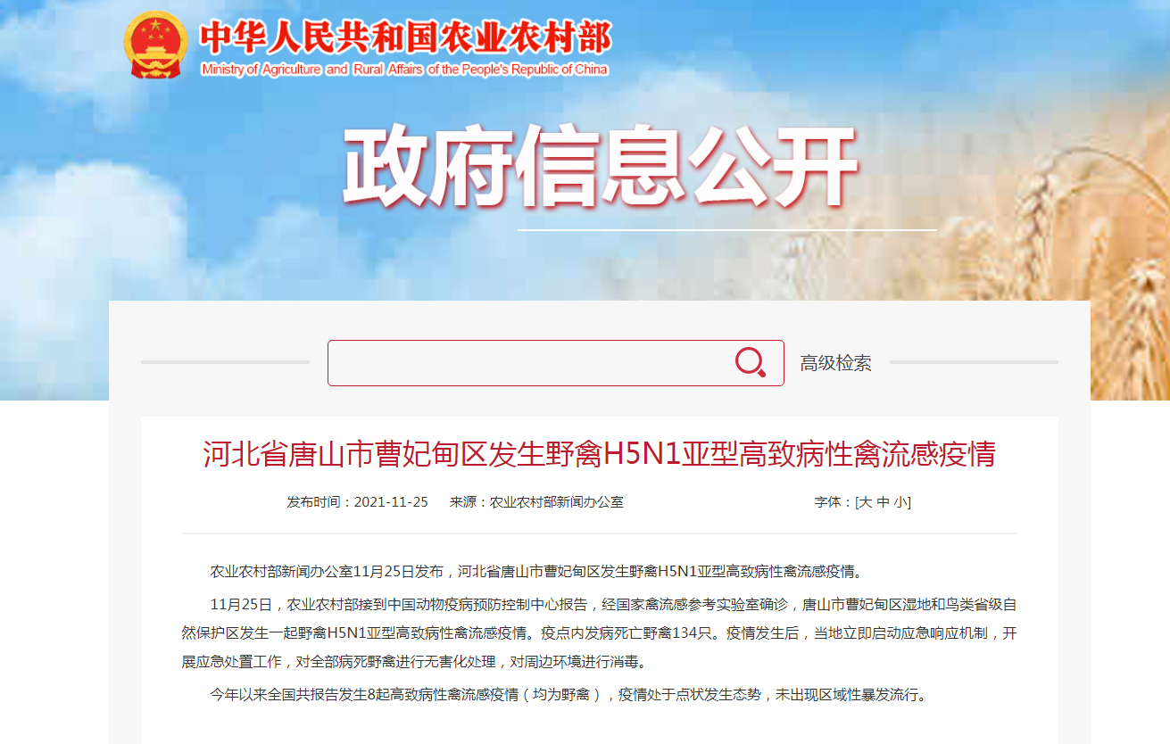 農(nóng)業(yè)農(nóng)村部新聞辦公室11月25日發(fā)布,河北省唐山市曹妃甸區(qū)發(fā)生野禽H5N1亞型高致病性禽流感疫情。