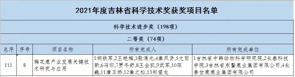 2021年11月19日,吉林省科技廳公布了《關(guān)于授予2021年吉林省科學(xué)技術(shù)獎的決定》,長春科技學(xué)院科研成果“梅花鹿產(chǎn)業(yè)發(fā)展關(guān)鍵技術(shù)研究與應(yīng)用”獲吉林省科學(xué)技術(shù)進(jìn)步獎二等獎,標(biāo)志著梅花鹿產(chǎn)業(yè)研究喜結(jié)碩果,為鄉(xiāng)村振興注入了新動能,為吉林省鹿產(chǎn)業(yè)發(fā)展提供了重要的技術(shù)支撐。
