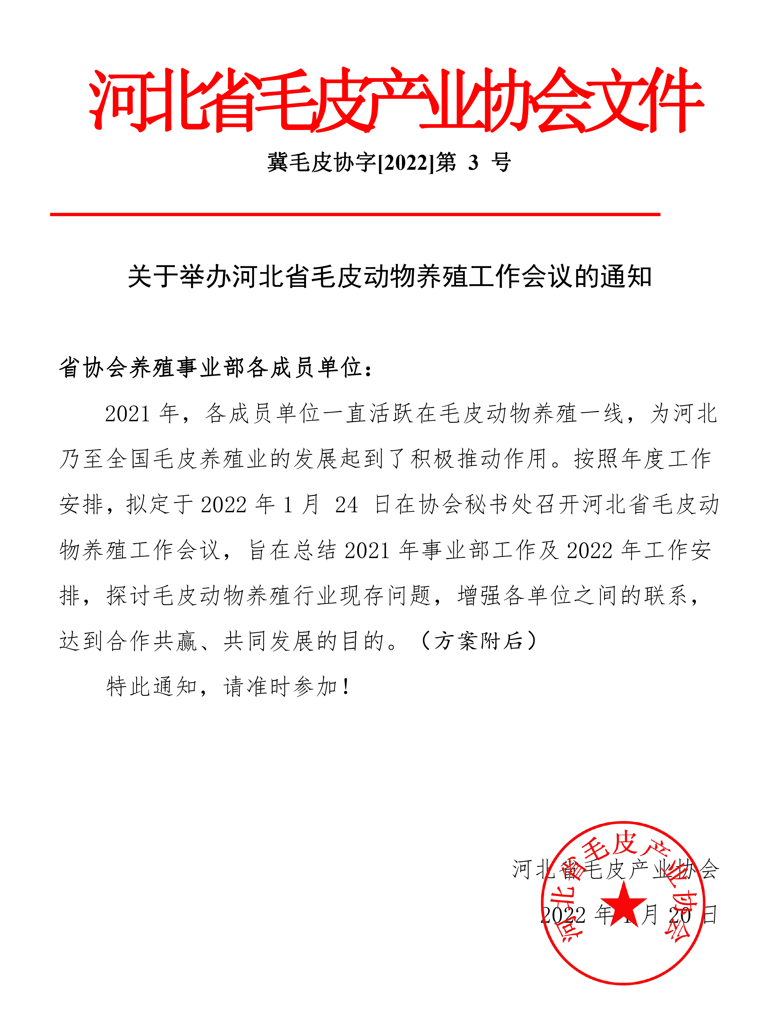 2021年,各成員單位一直活躍在毛皮動物養(yǎng)殖一線,為河北乃至全國毛皮養(yǎng)殖業(yè)的發(fā)展起到了積極推動作用。按照年度工作安排,擬定于2022年1月 24 日在協(xié)會秘書處召開河北省毛皮動物養(yǎng)殖工作會議,旨在總結(jié)2021年事業(yè)部工作及2022年工作安排,探討毛皮動物養(yǎng)殖行業(yè)現(xiàn)存問題,增強各單位之間的聯(lián)系,達到合作共贏、共同發(fā)展的目的。(方案附后)