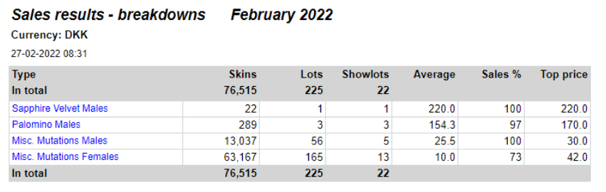 丹麥二月拍賣會按計劃是28日結(jié)束,26日水貂皮的拍賣就結(jié)束了,27日拍賣其它皮張后也就結(jié)束了。拍賣會官方網(wǎng)站沒有顯示水貂具體的拍賣結(jié)果,只顯示了少量品種,如下圖:
