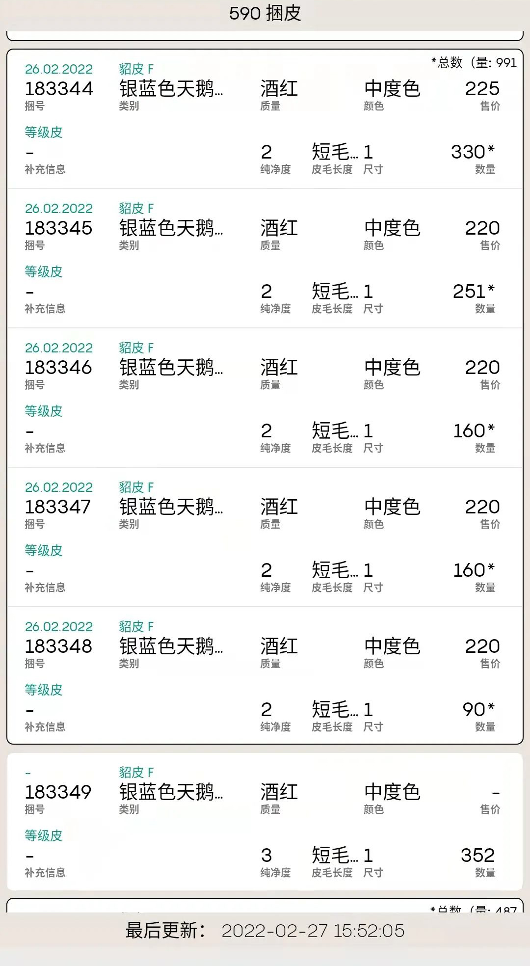 4、銀藍(lán)天鵝絨母貂590捆,總量11萬多張,售出極少,部分價格如下。