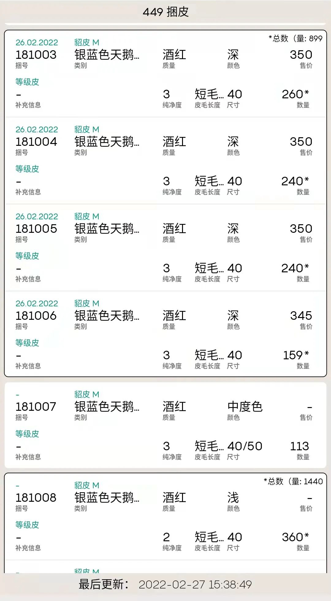 2、銀藍(lán)天鵝絨公貂449捆,總量10萬多張,售出極少,部分價格如下。