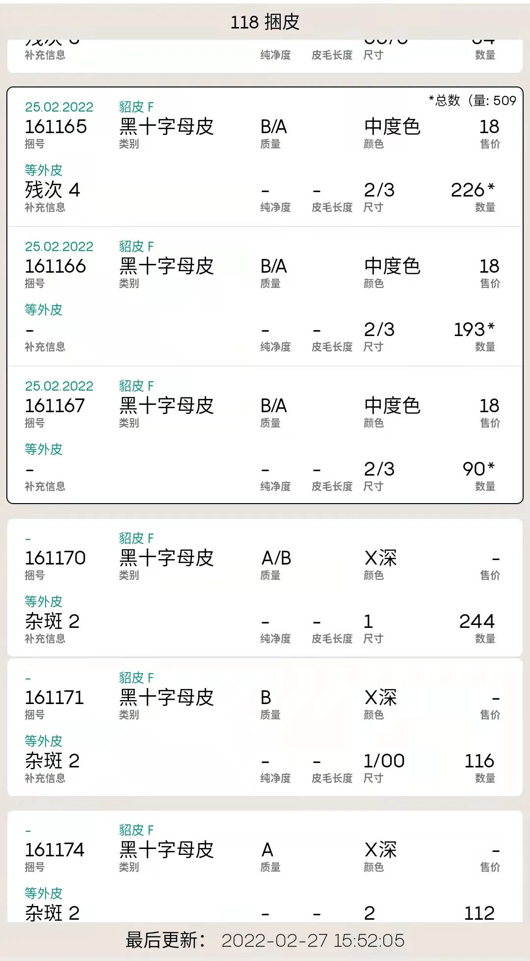 6、黑十字母貂118捆,總量2萬多張,售出極少。