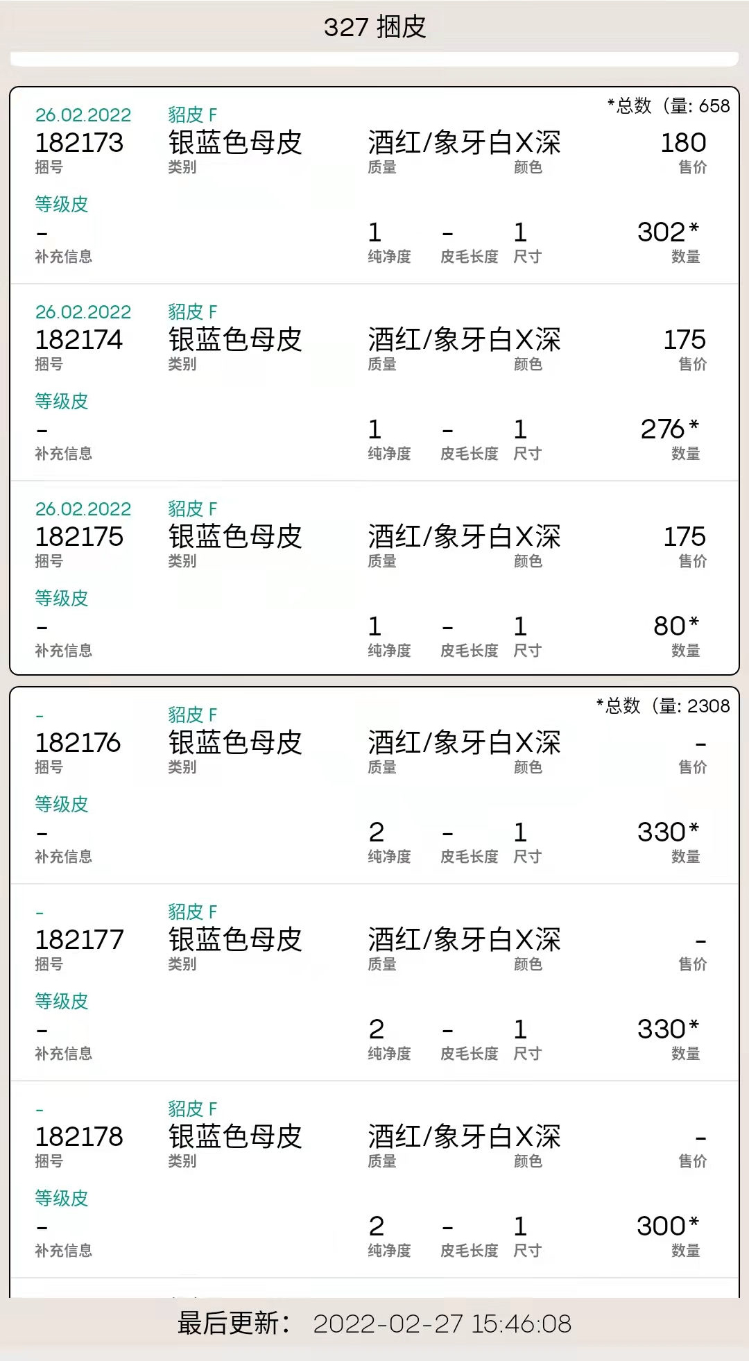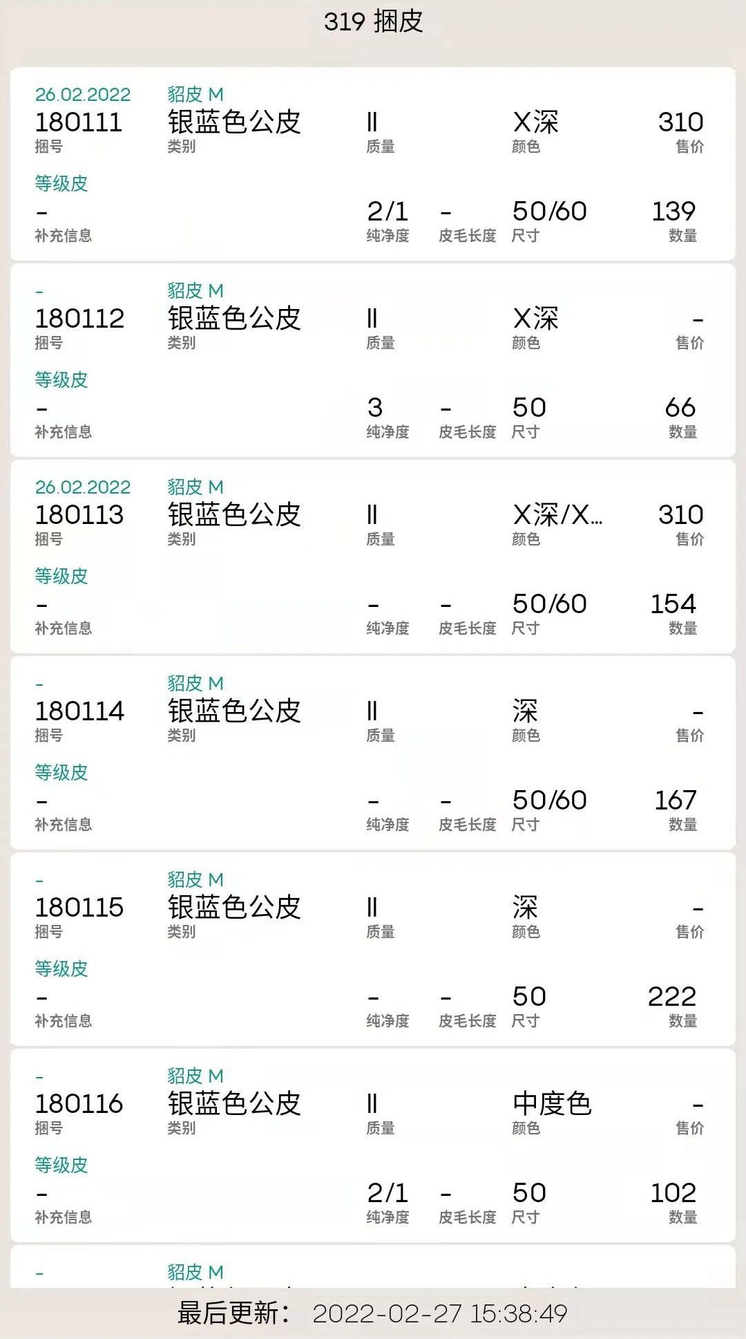 1、銀藍(lán)公貂,319捆,總量6.9萬多張,售出極少,部分價格如下。
