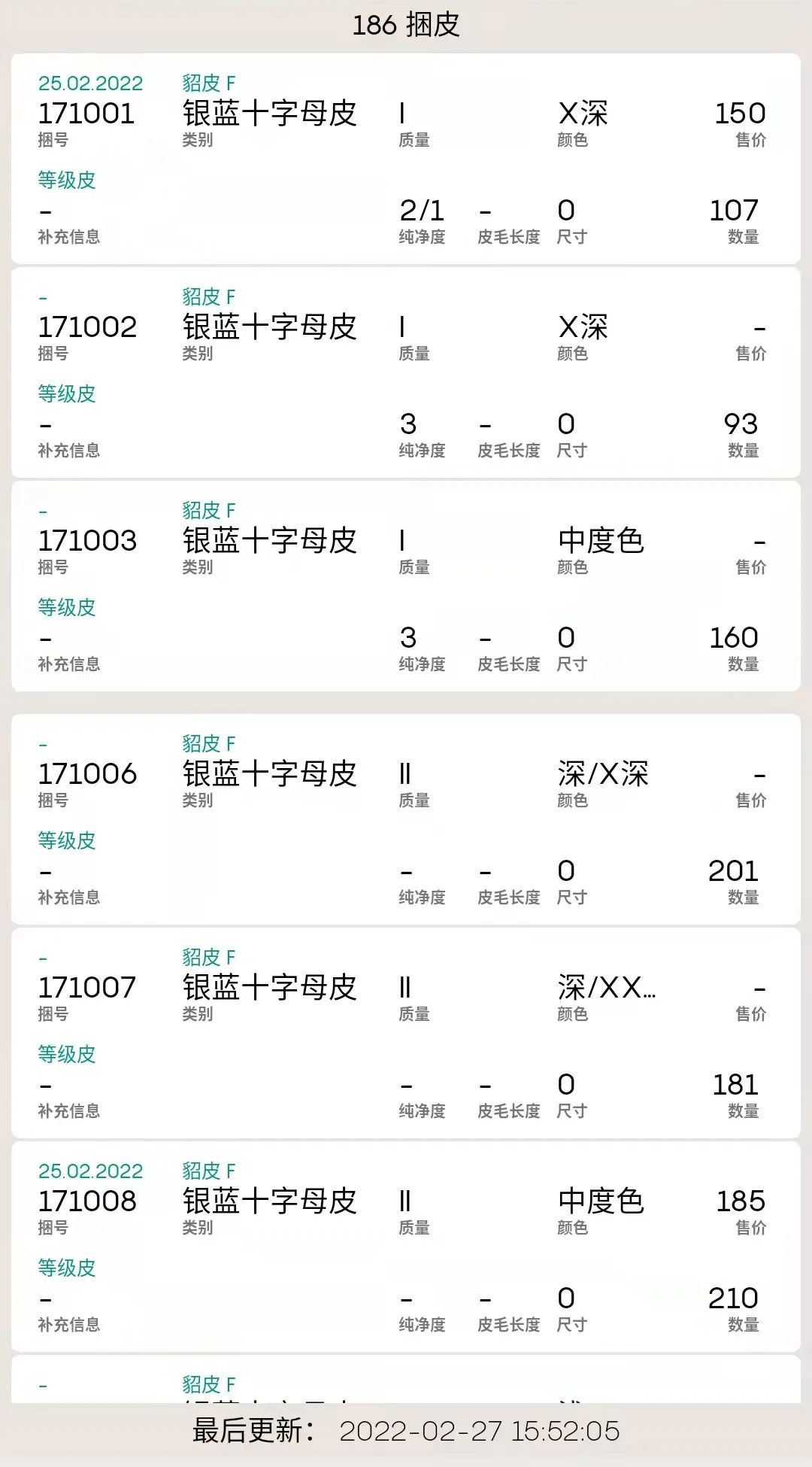 7、銀藍(lán)十字公貂195捆,總量3.4萬多張,未見售出。