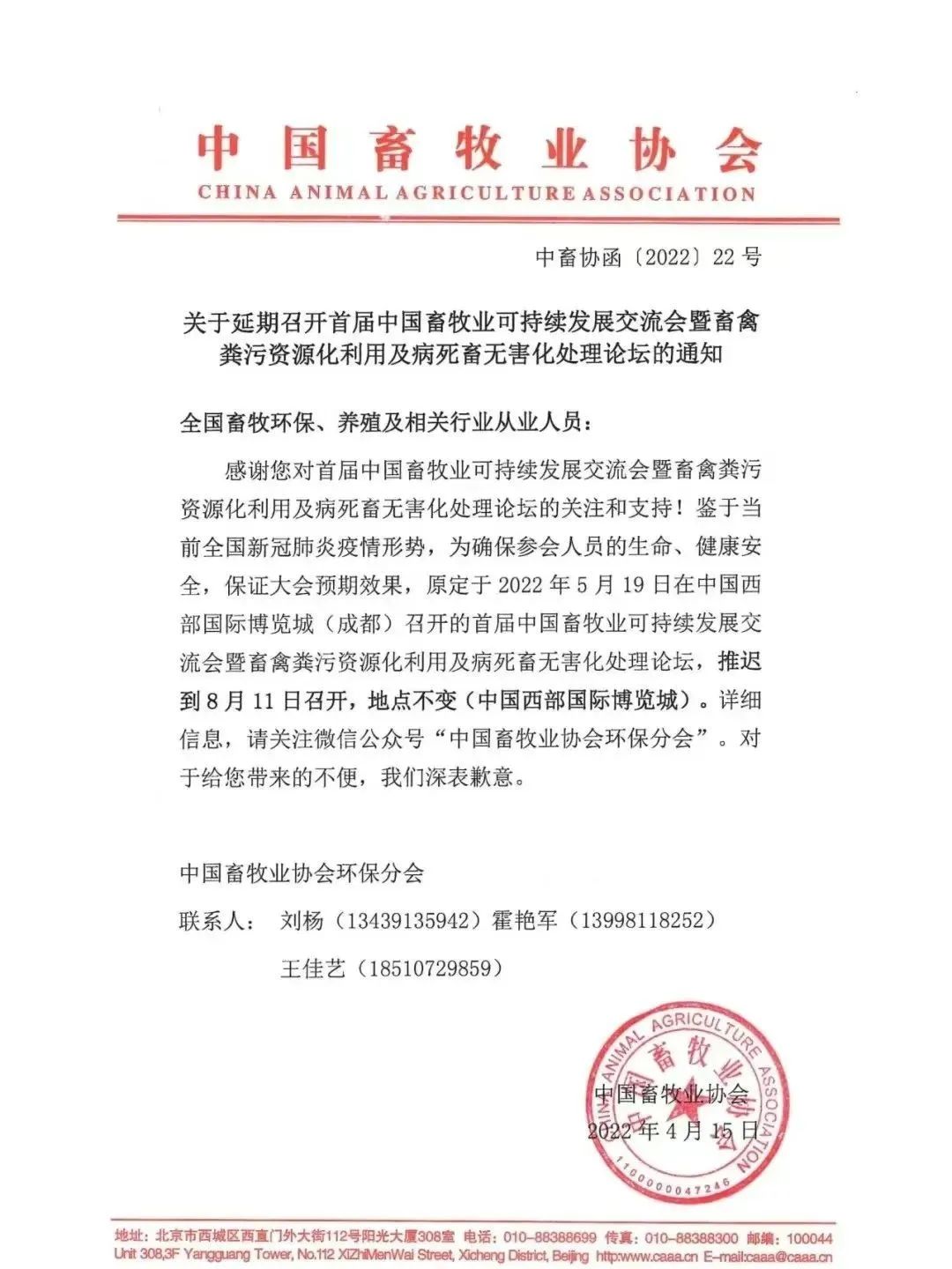 關(guān)于延期召開首屆中國(guó)畜牧業(yè)可持續(xù)發(fā)展交流會(huì)暨畜禽糞污資源化利用及病死畜無(wú)害化處理論壇的通知