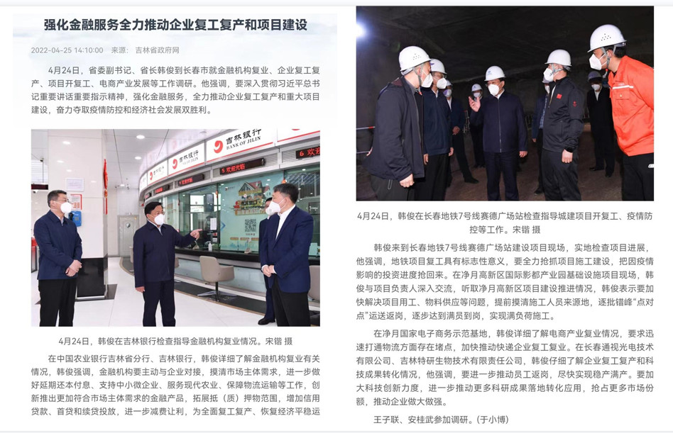 吉林省委副書記、省長韓俊到特研生物調(diào)研指導科技成果轉(zhuǎn)化及疫情防控工作