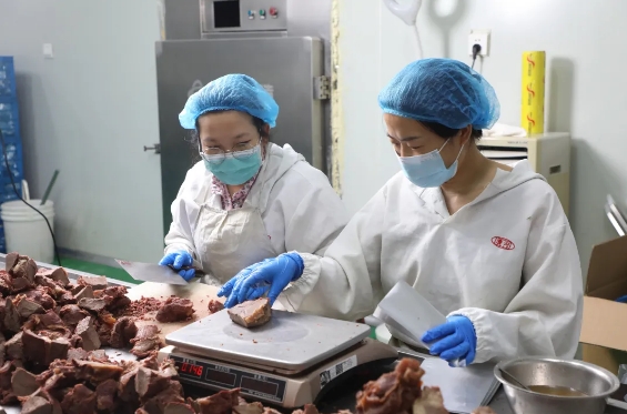 走進(jìn)位于河北省保定市徐水區(qū)京港澳高速口的漕河驢肉食品有限公司(北方驢業(yè)聯(lián)席會首批發(fā)起單位),煮肉、分割、殺菌、包裝……各車間的工人們緊張忙碌著。內(nèi)包裝車間女工智微說:“感覺這陣子是近幾年來最忙碌的一段時間了,我每天都要做4000多袋真空包裝。”煮肉車間內(nèi),熱氣氤氳中,四口特制大鍋正在煮制驢肉。煮肉師傅張賓介紹,現(xiàn)在每天都要加工驢肉1.5噸左右,根據(jù)需要煮制方法和時長也不同,一般都是老湯秘法煮制,加入20余種天然香辛料,經(jīng)大火攻、小火煨、油蓋頂壓鍋燜8小時左右出鍋。