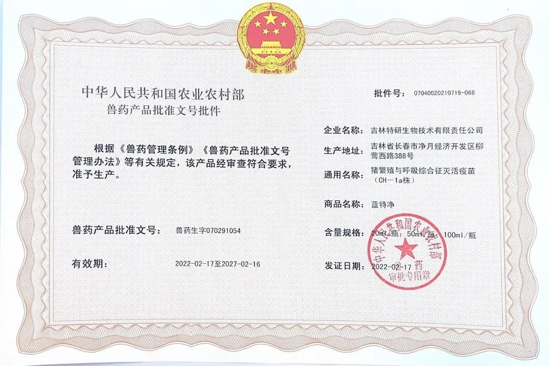 2022年2月18日,特研生物“藍(lán)特凈-豬繁殖與呼吸綜合征滅活疫苗”取得了中華人民共和國農(nóng)業(yè)農(nóng)村部獸藥產(chǎn)品批準(zhǔn)文號(hào)批件?! ?ldquo;藍(lán)特凈”的上市,不僅豐