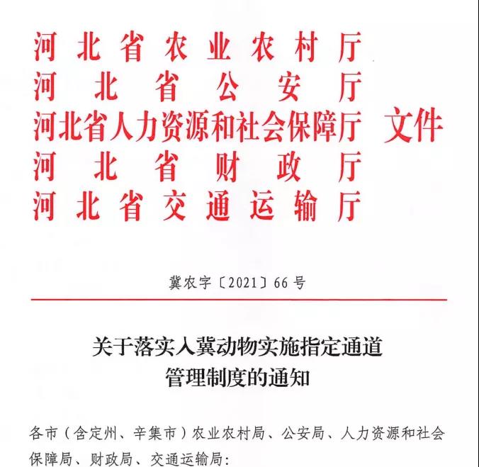 各市(含定州、辛集市)農業(yè)農村局、公安局、人力資源和社會保障局、財政局、交通運輸局: 為貫徹落實《動物防疫法》,加強入冀動物監(jiān)督管理,嚴防重大動物疫病傳入,保障全