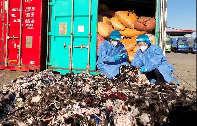 關員現場清點查獲的動物毛皮邊角料 近日,黃島海關查獲1批禁止進口動物毛皮邊角料,共計5.67噸?! ‘斎?,海關關員在查驗一批申報品名為“貂毛皮裁片、兔毛皮裁片