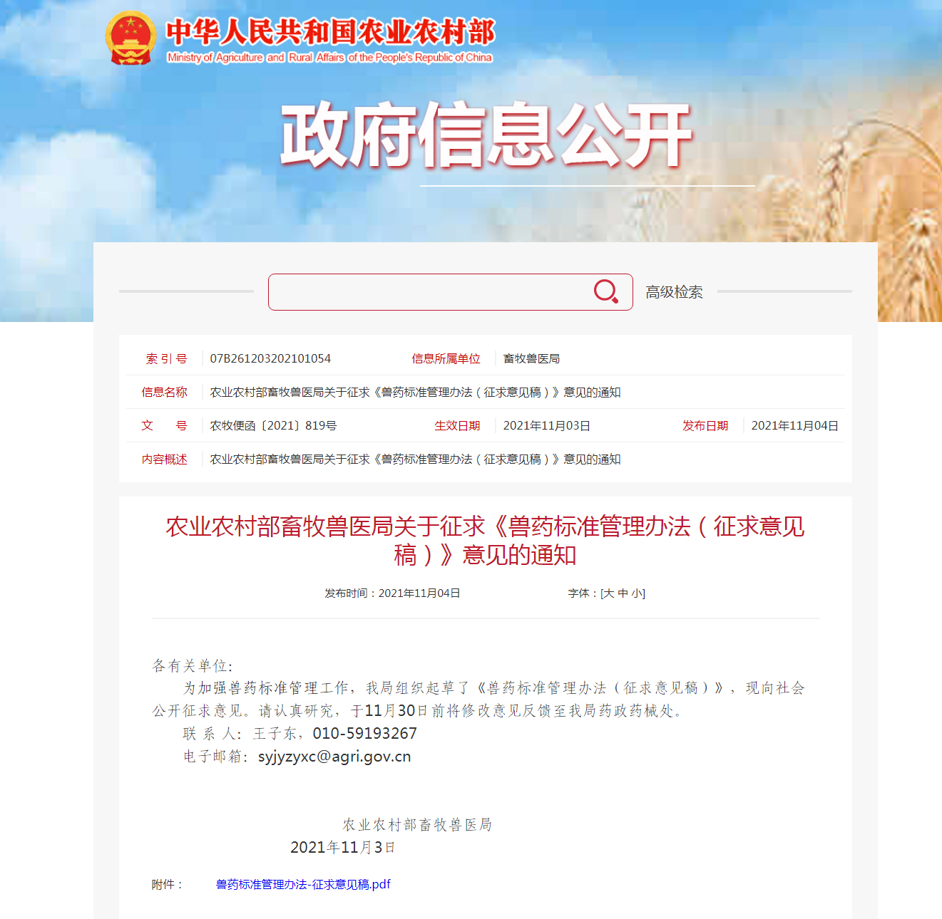 農(nóng)業(yè)農(nóng)村部畜牧獸醫(yī)局關(guān)于征求《獸藥標(biāo)準(zhǔn)管理辦法(征求意見稿)》意見的通知 各有關(guān)單位:為加強(qiáng)獸藥標(biāo)準(zhǔn)管理工作,我局組織起草了《獸藥標(biāo)準(zhǔn)管理辦法(征求意見稿)》,現(xiàn)向社