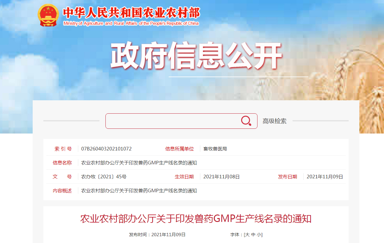 農(nóng)業(yè)農(nóng)村部辦公廳關(guān)于印發(fā)獸藥GMP生產(chǎn)線名錄的通知 各省、自治區(qū)、直轄市農(nóng)業(yè)(農(nóng)牧)、畜牧獸醫(yī)廳(局、委),新疆生產(chǎn)建設(shè)兵團(tuán)農(nóng)業(yè)農(nóng)村局: 為貫徹落實(shí)《獸藥生產(chǎn)質(zhì)量管理