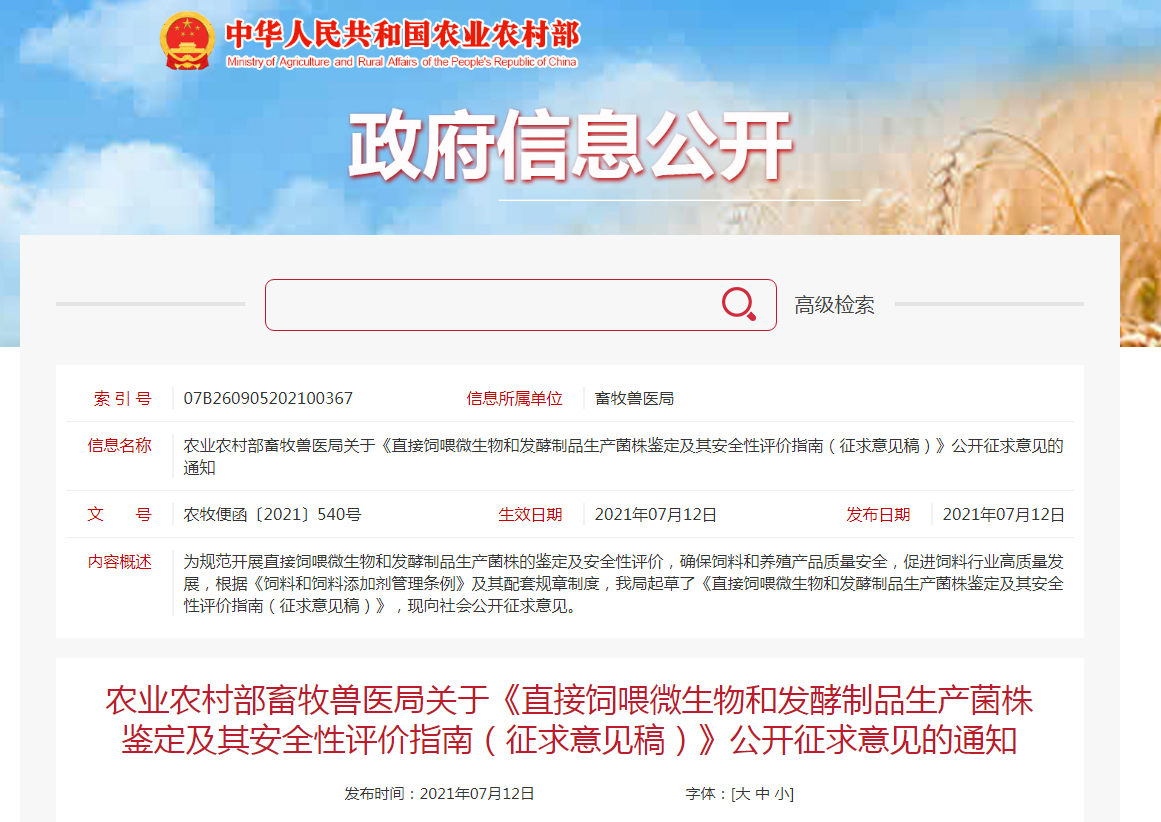 農(nóng)業(yè)農(nóng)村部對《直接飼喂微生物和發(fā)酵制品生產(chǎn)菌株鑒定及其安全性評價指南》公開征求意見農(nóng)牧便函〔2021〕540號 為規(guī)范開展直接飼喂微生物和發(fā)酵制品生產(chǎn)菌株的鑒定及