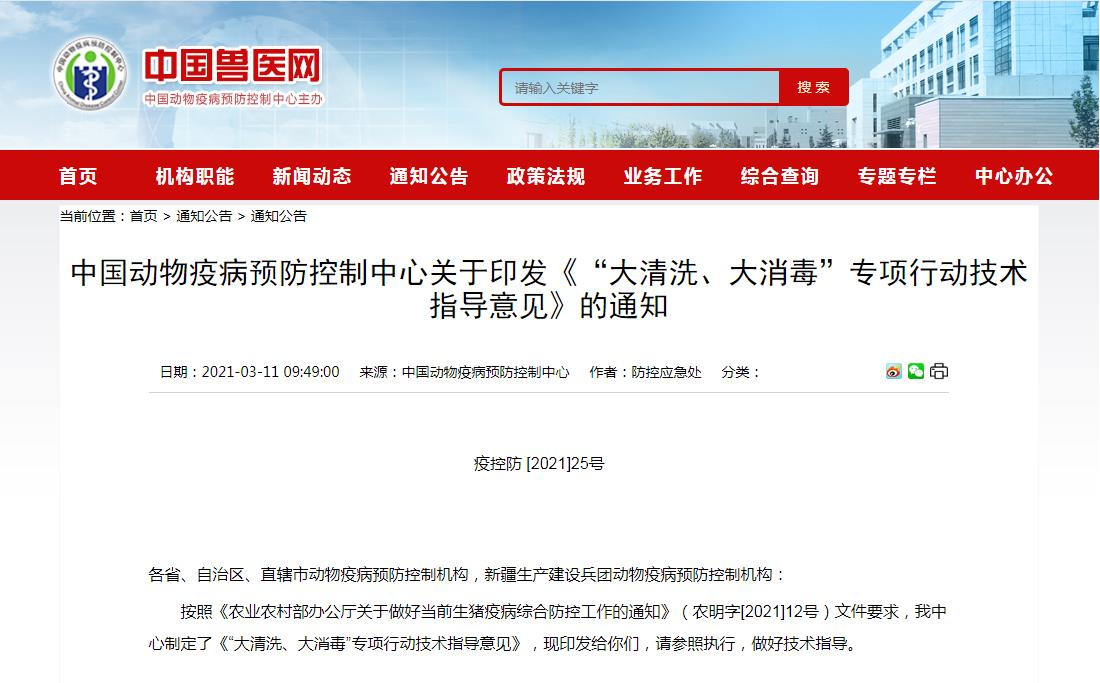 按照《農(nóng)業(yè)農(nóng)村部辦公廳關(guān)于做好當前生豬疫病綜合防控工作的通知》(農(nóng)明字﹝2021﹞12號)文件要求,中國動物疫病預防控制中心制定了《“大清洗、大消毒”專項行動技