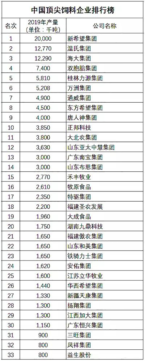 根據(jù)WATT國(guó)際傳媒的頂尖飼料公司數(shù)據(jù)庫(kù)顯示,2019年,中國(guó)有33家動(dòng)物飼料生產(chǎn)公司的復(fù)合飼料產(chǎn)量達(dá)到或超過80萬(wàn)噸。2020年頂級(jí)飼料企業(yè)報(bào)告和2019年全球頂尖飼料生產(chǎn)商的排名,