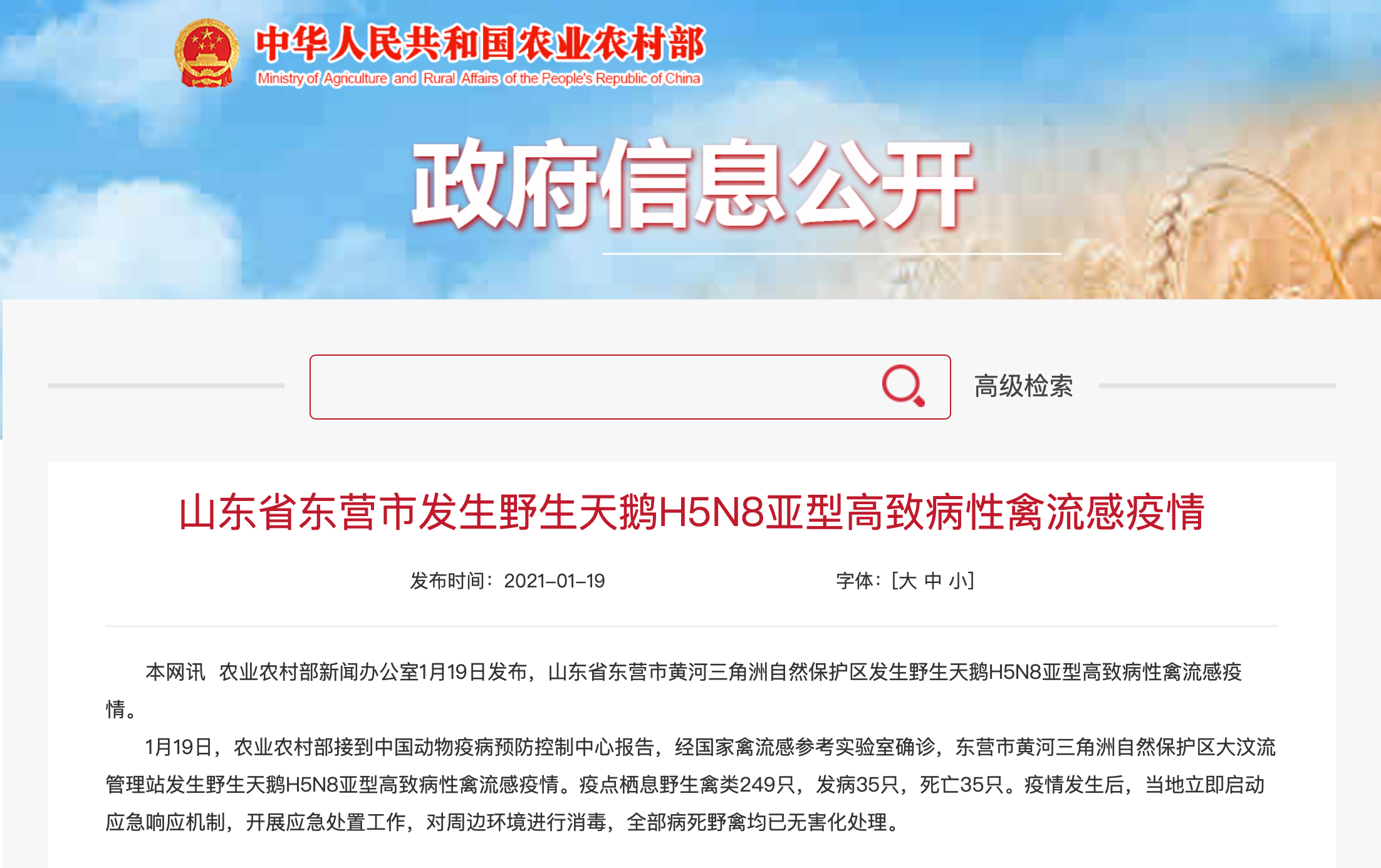 1月19日,農(nóng)業(yè)農(nóng)村部接到中國動物疫病預防控制中心報告,經(jīng)國家禽流感參考實驗室確診,東營市黃河三角洲自然保護區(qū)大汶流管理站發(fā)生野生天鵝H5N8亞型高致病性禽流感疫情